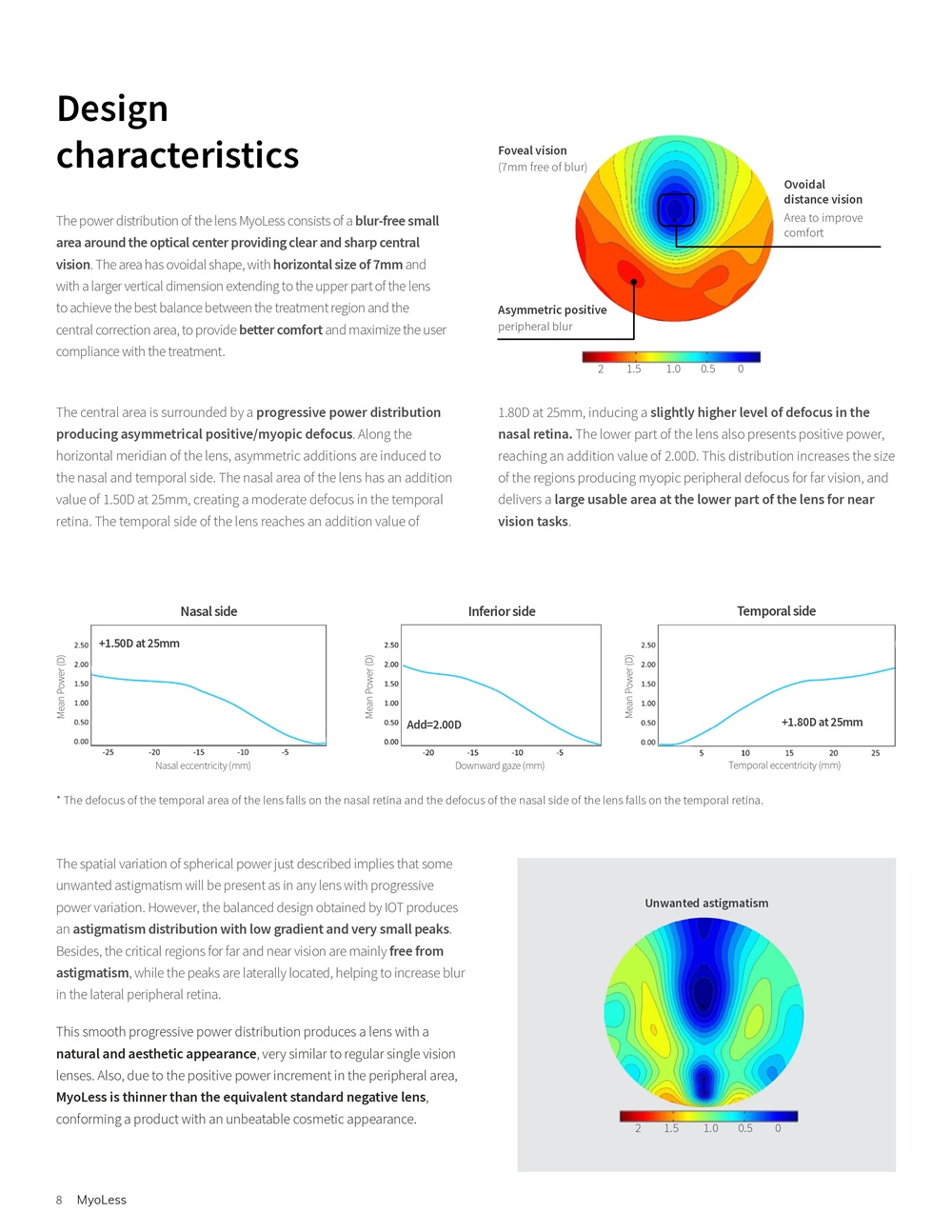 8. SD progressive lens design spreads unwanted astigmatism across larger areas of the lens surface, thereby reducing the overall magnitude of blur at the expense of narrowing the zones of perfectly clear vision. The astigmatic error may even affect the distance zone. Consequently, softer progressive lenses generally show the following characteristics: Narrower distance zones, wider near zones, and lower, more slowly increasing levels of astigmatism (widely spaced contours). The max. amount of unwanted astigmatism is reduced to an Incredible level of approx. 75% of the addition power. This design variant is partly applicable for modern working places.
